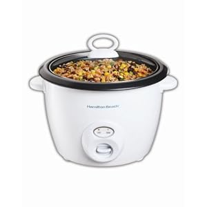 The Hamilton Beach Rice Cooker automatically cooks rice, then shifts to keep warm. Other features include a nonstick bowl and glass lid. Accessories included.
